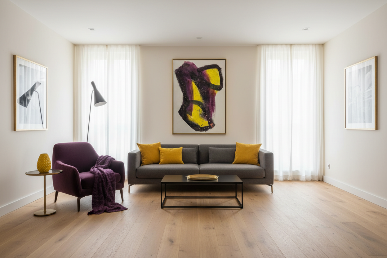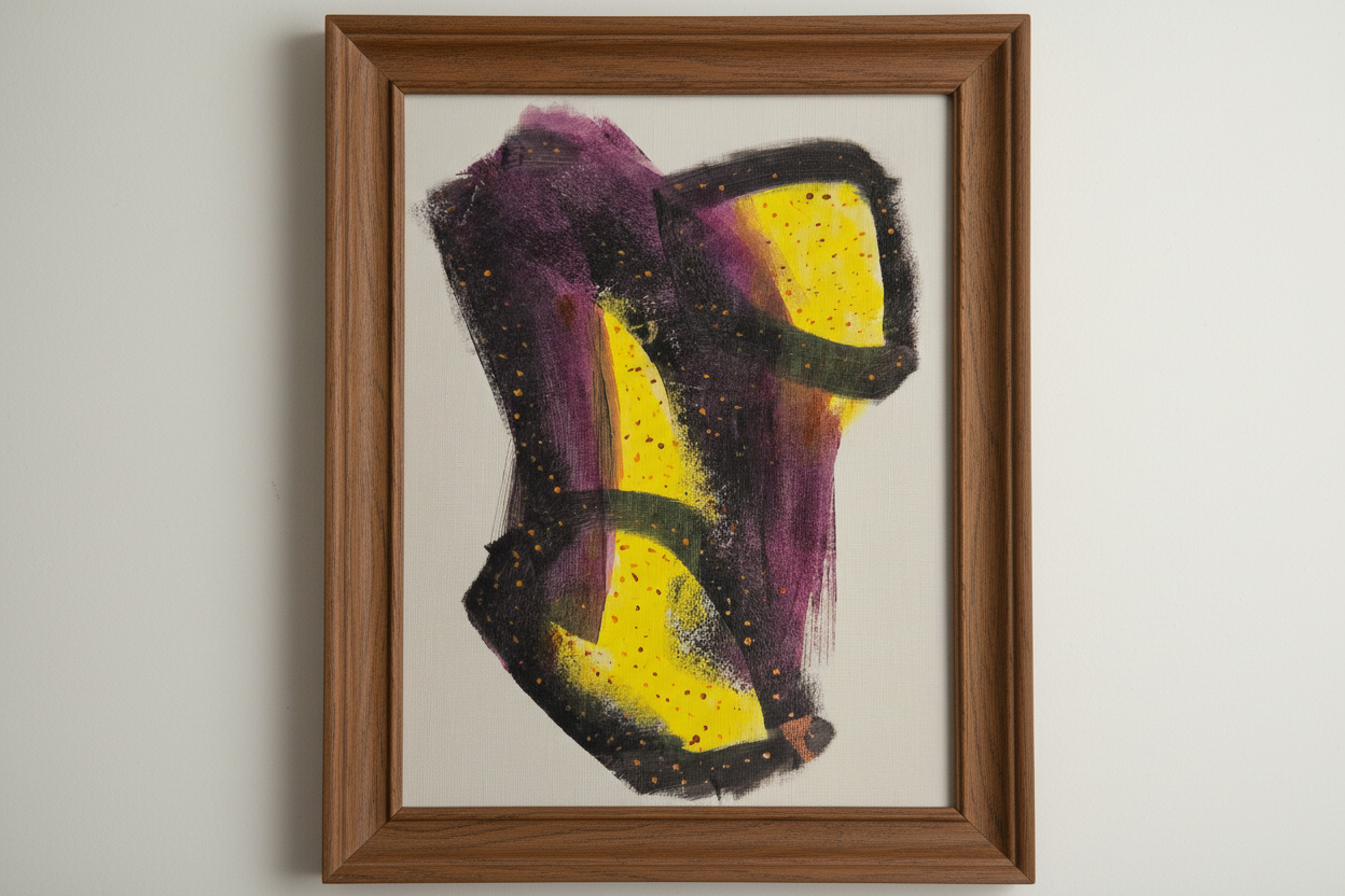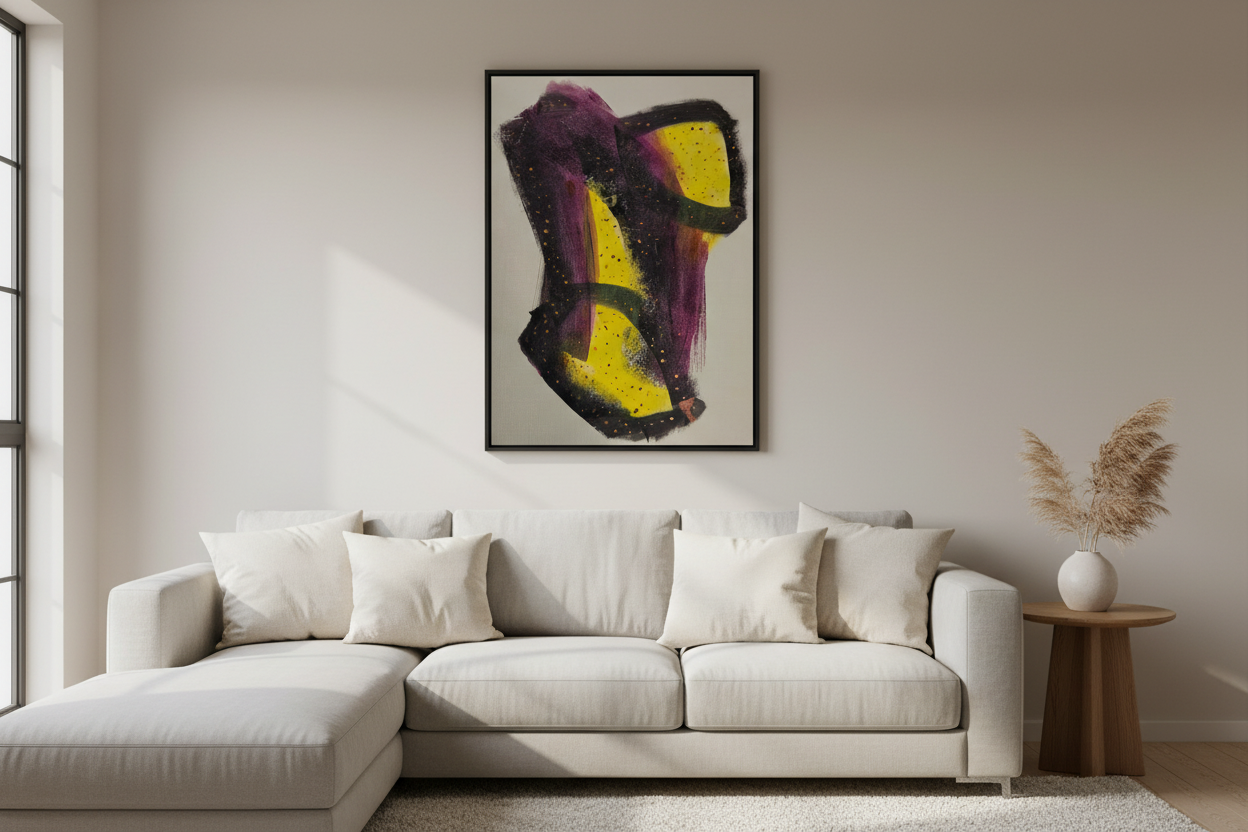 Breaking the Veil is a visceral exploration of the tension between shadow and illumination. Dominated by deep, sweeping strokes of midnight purple and indigo, the composition is anchored by a core of vibrant, textured yellow that refuses to be contained.