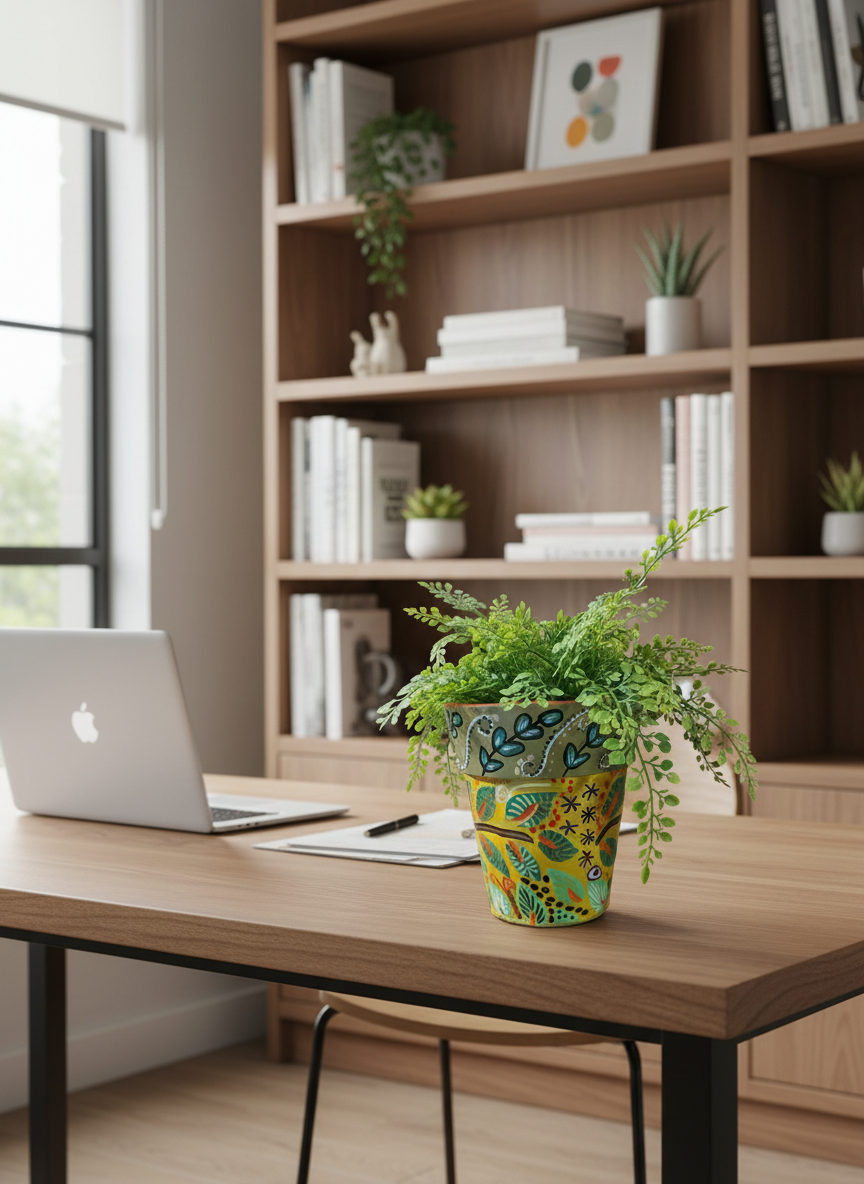 Featuring bold folk art leaves, shimmering gold accents, deep greens, sunny yellows, earthy browns, delicate white swirls, and metallic gold dots creating a richly textured, bohemian vibe. More than a pot—it’s a centerpiece.